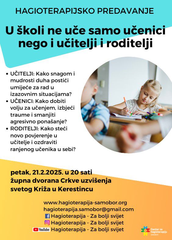 Hagioterapija – Za bolji svijet organizira hagioterapijsko predavanje naziva “U školi ne uče samo učenici nego i učitelji i roditelji” koje će se održati ovog petka, 21. veljače, s početkom u 20 sati u Župnoj crkvi Uzvišenja svetog Križa u Kerestincu.