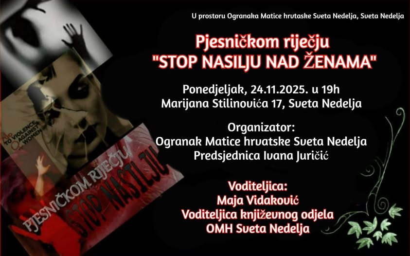 U povodu Svjetskog dana borbe protiv nasilja nad ženama koji se obilježava 25. studenog, Ogranak Matice hrvatske u Svetoj Nedelji priprema posebno poetsko druženje pod nazivom “Pjesničkom riječju ‘Stop nasilju nad ženama” koje će se održati 24. studenog s početkom u 19 sati u prostorima Ogranka.